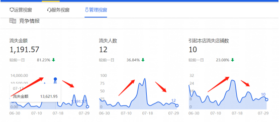 所以竞争小流量大的渠道说的就是它了,而且我给大家看一个案例店铺,这家店铺在7月中旬的时候流失金额高达13621!竞争店铺高达30家!