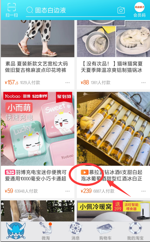 由此可知,人群标签越精准的宝贝,获取猜你喜欢的几率越大,而还有一些良好的行为,可以增加我们的产品被手淘首页抓取的几率。首先第一个点是主图视频以及第五张的白底图,我们看上图,有一个小小的视频播放的小按钮,而这个,就是有主图视频的宝贝,会有特殊的展示形态。