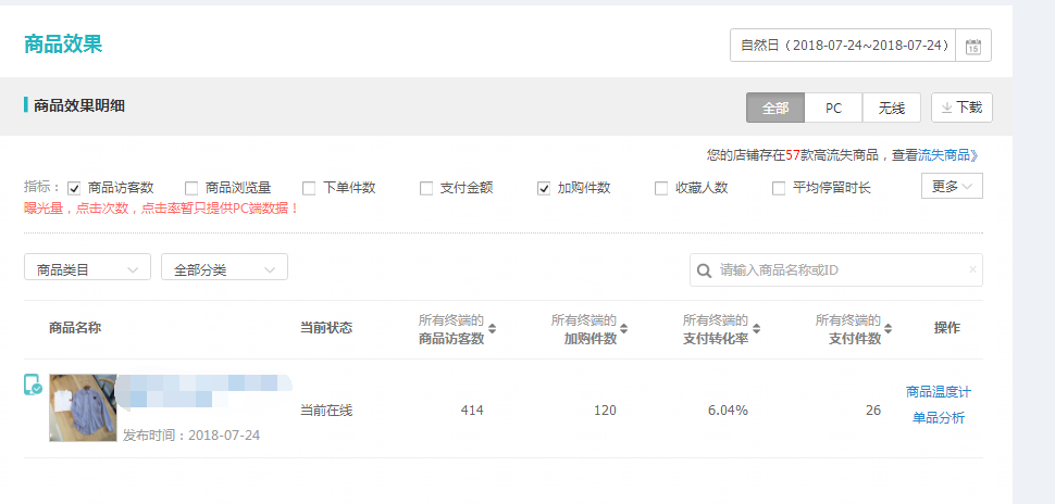 这是我手里一个店铺的其中某个秋款,24号第一波秋款上新,当天卖了26件,转化率非常高,加购数量有120,为秋款做了一个很好的开头。